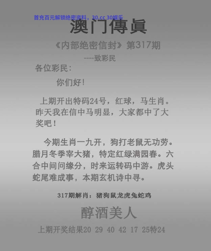 传真317期 今期生肖一九开,狗打老鼠无功劳。 腊月冬季宰大猪,特定红绿满园春。 六合中间问缘分,时来运转码中游。 虎头蛇尾难成事,本期玄机诗中寻。 醇酒美人 解:今期腊月冬季宰大猪,解家禽生肖牛猪鸡羊狗马,特定红绿满园春,解红波。 拐特生肖:鸡猴羊鼠狗牛兔龙虎 主特:21.33.22.34.11.23.18.30.20.32.17.29 |