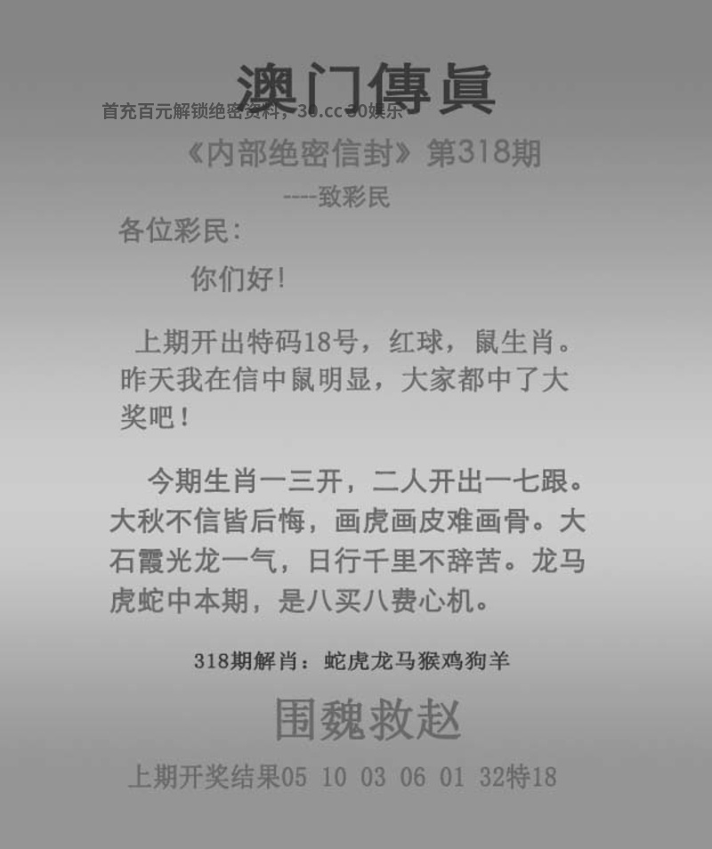 传真318期 今期生肖一三开,二人开出一七跟。 大秋不信皆后悔,画虎画皮难画骨。 大石霞光龙一气,日行千里不辞苦。 龙马虎蛇中本期,是八买八费心机。 围魏救赵 解:今期大秋不信皆后悔,解牛虎马羊狗猪,日行千里不辞苦,解龙兔蛇马羊猴。 拐特生肖:鼠龙牛马虎鸡猪兔猴 |